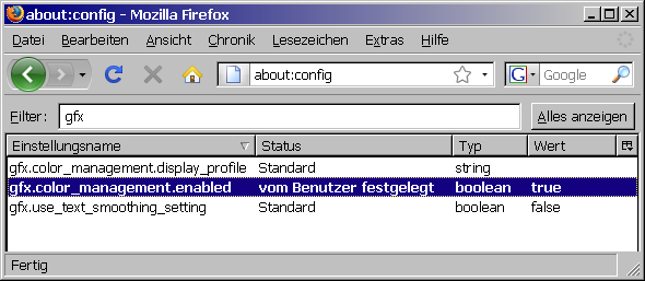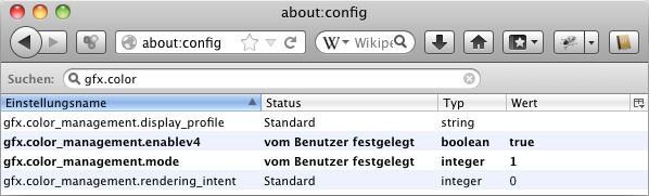 Mit einem neueren Webbrowser können auch Windows-Benutzer mit Farbmanagement surfen. Zunächst war dies nur mit Safari von Apple und mit Firefox ab Version 3 (Open Source, zu finden auf mozilla.com) möglich. Mittlerweile funktioniert es nun auch im Internet Explorer, siehe weiter unten. Safari unterstützt Farbprofile bereits von Anfang an ohne weiteres Zutun (sowohl unter Mac OS X als auch unter Windows); bei Firefox 3 war das Farbmanagement standardmässig ausgeschaltet; um es zu aktivieren, geben Sie in der Adresszeile «about:config» ein und bestätigen im folgenden Dialogfenster den Zugriff. Danach finden Sie mit dem Filter «gfx» die relevante Option gfx.color_management.enabled und können diese mit einem Doppelklick darauf von false nach true umschalten; in aktuellen Firefox-Versionen sind zwei Optionen umzuschalten: gfx.color_management.enablev4 auf true und gfx.color_management.mode auf 1 (siehe Screenshots). Nach dem Beenden und neu Starten von Firefox ist dann das Farbmanagement aktiv, das heisst, Farbprofile in Bildern werden bei der Anzeige berücksichtigt. Für eine farbtreue Wiedergabe brauchen Sie ausserdem ein individuell ausgemessenes Farbprofil zu Ihrem Monitor, das dessen Eigenschaften charakterisiert und Fehler zu verringern hilft.